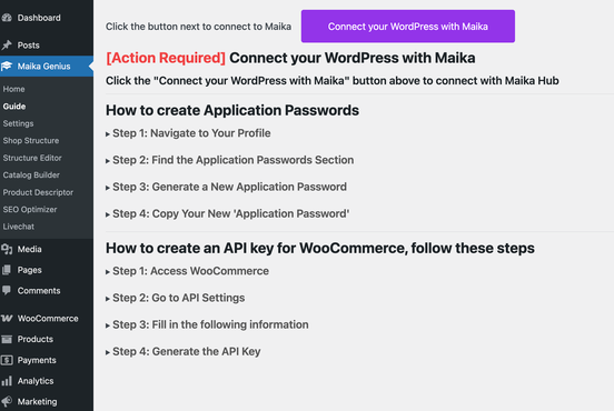 Step 3: After completing the creation of the Application and an API key, you will refresh the page and click "Connect your WordPress with Maika".