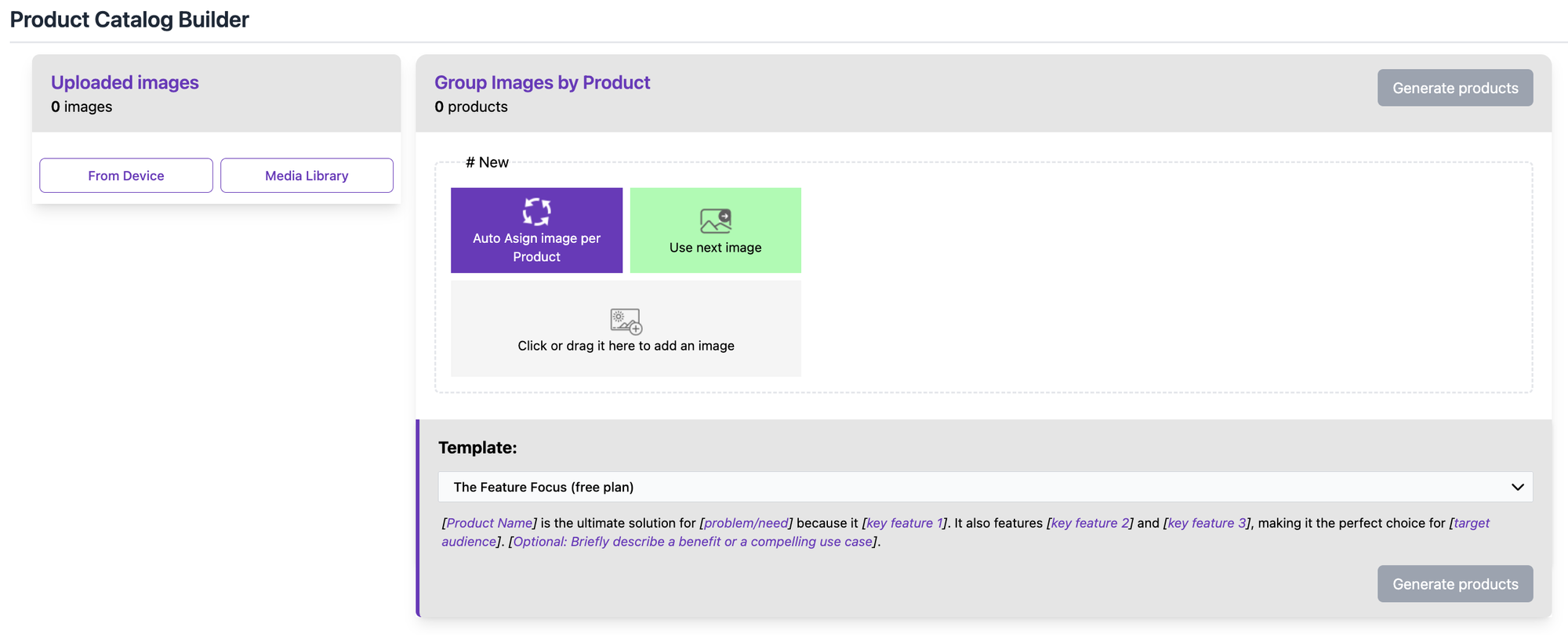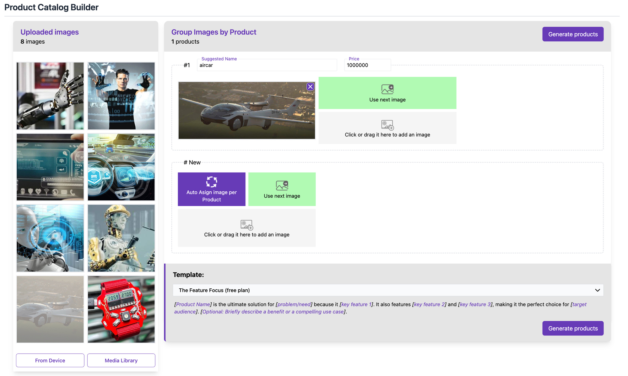 - Catalog Builder: Build your entire product catalog from scratch in minutes. Perfect for new online stores or when adding large numbers of products quickly. Key features include turning images into products, automated descriptions, intelligent categorization, and complete catalog setup in just 5 minutes.