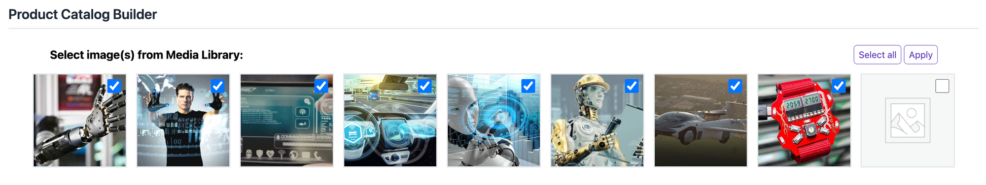 - Media Library – select existing images from WordPress (choose individual images or click “Select All” → “Apply”). (image 2)