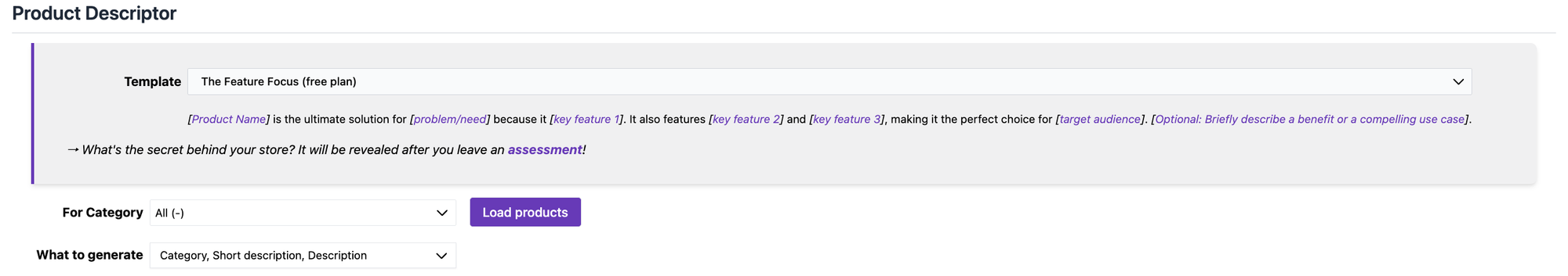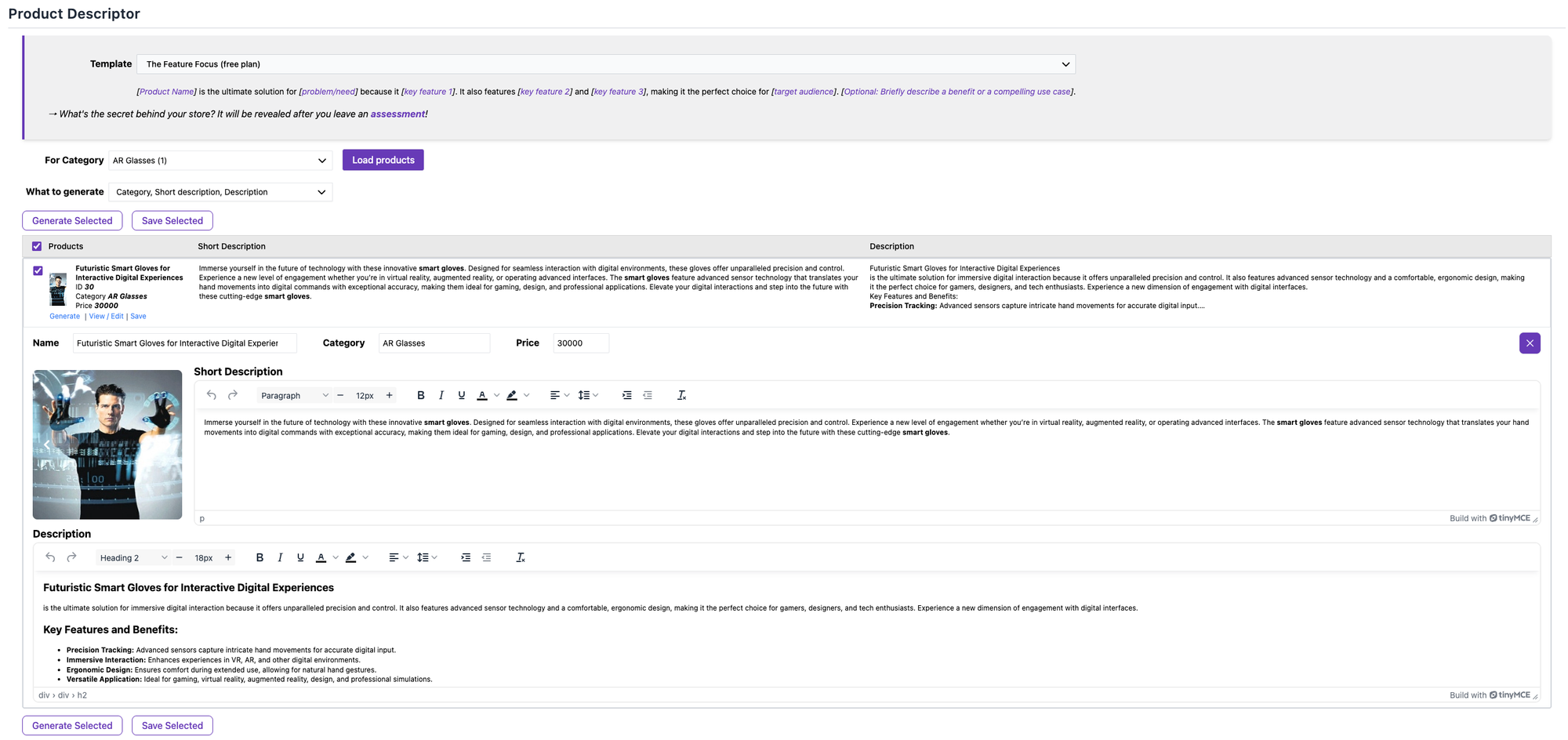 The Product Descriptor feature uses advanced Generative AI to create unique, engaging, and SEO-optimized product descriptions based on your product data.