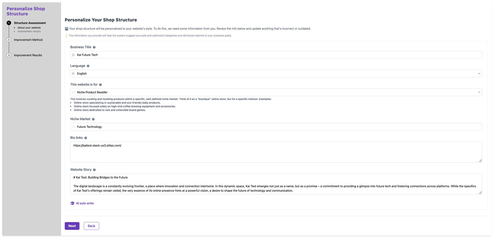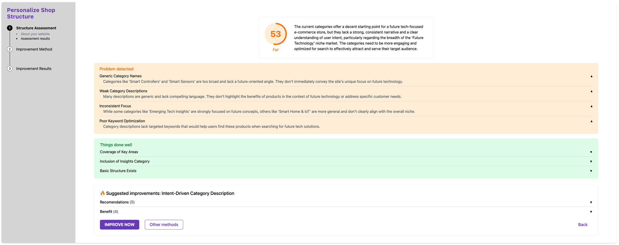 The Shop Structure feature provides comprehensive tools for evaluating and improving your e-commerce website's organization, from initial assessment to final product categorization, ensuring a more user-friendly and efficient online store structure.