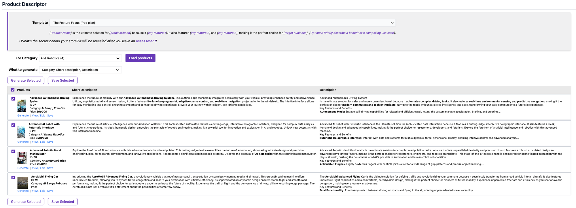 - Product Descriptor: Let AI write your product descriptions. Generate high-quality, unique, and SEO-optimized product descriptions in minutes with personalized templates, perfect wording, and error-free content.