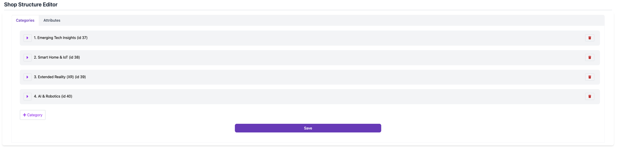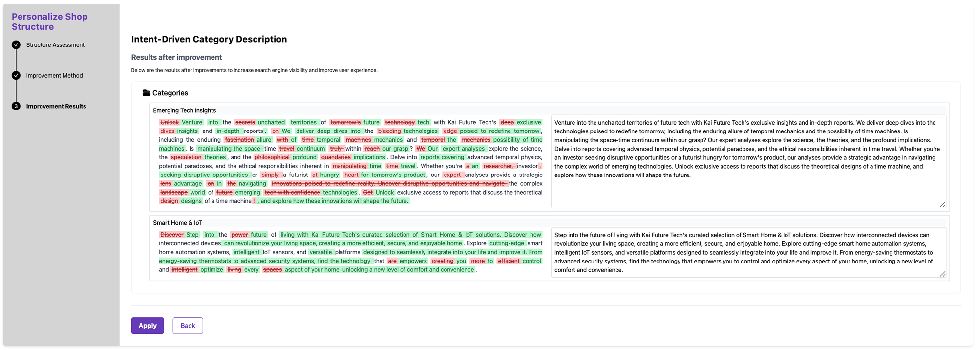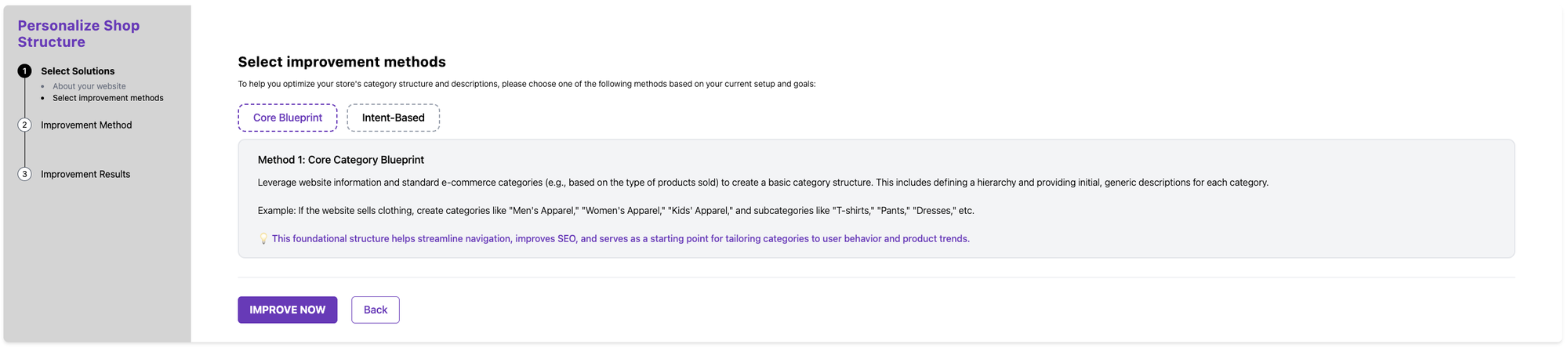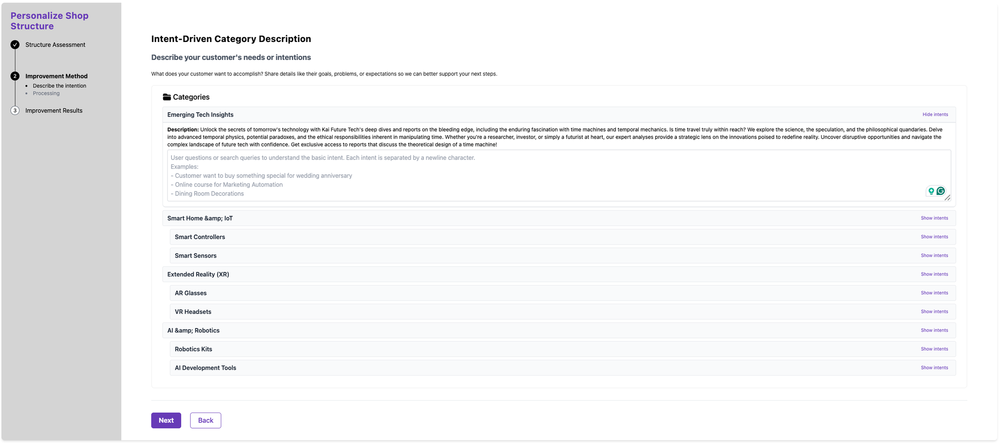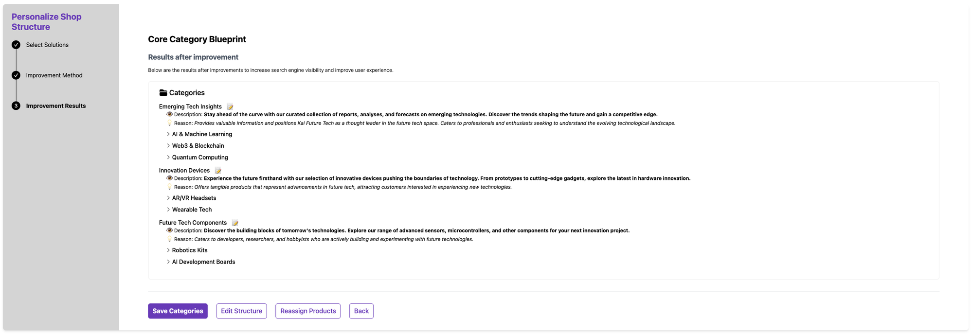 - Shop Structure: Addresses the challenge of improving product categories when you have limited product descriptions. This feature helps solve the initial "cold-start" problem by providing strategies to bootstrap category creation and refinement when limited product data is available.